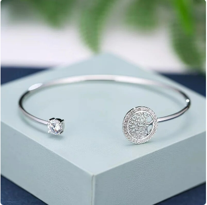 A delicate open bangle in either Silver or Gold featuring an intricate tree of life design inside a diamante circle that represents everlasting.