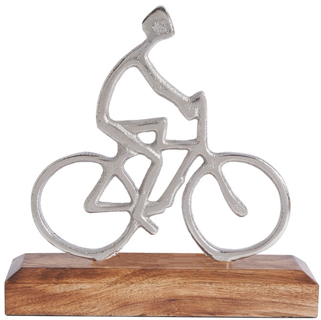 A decorative silver cyclist silhouette presented on a contrasting wooden base.