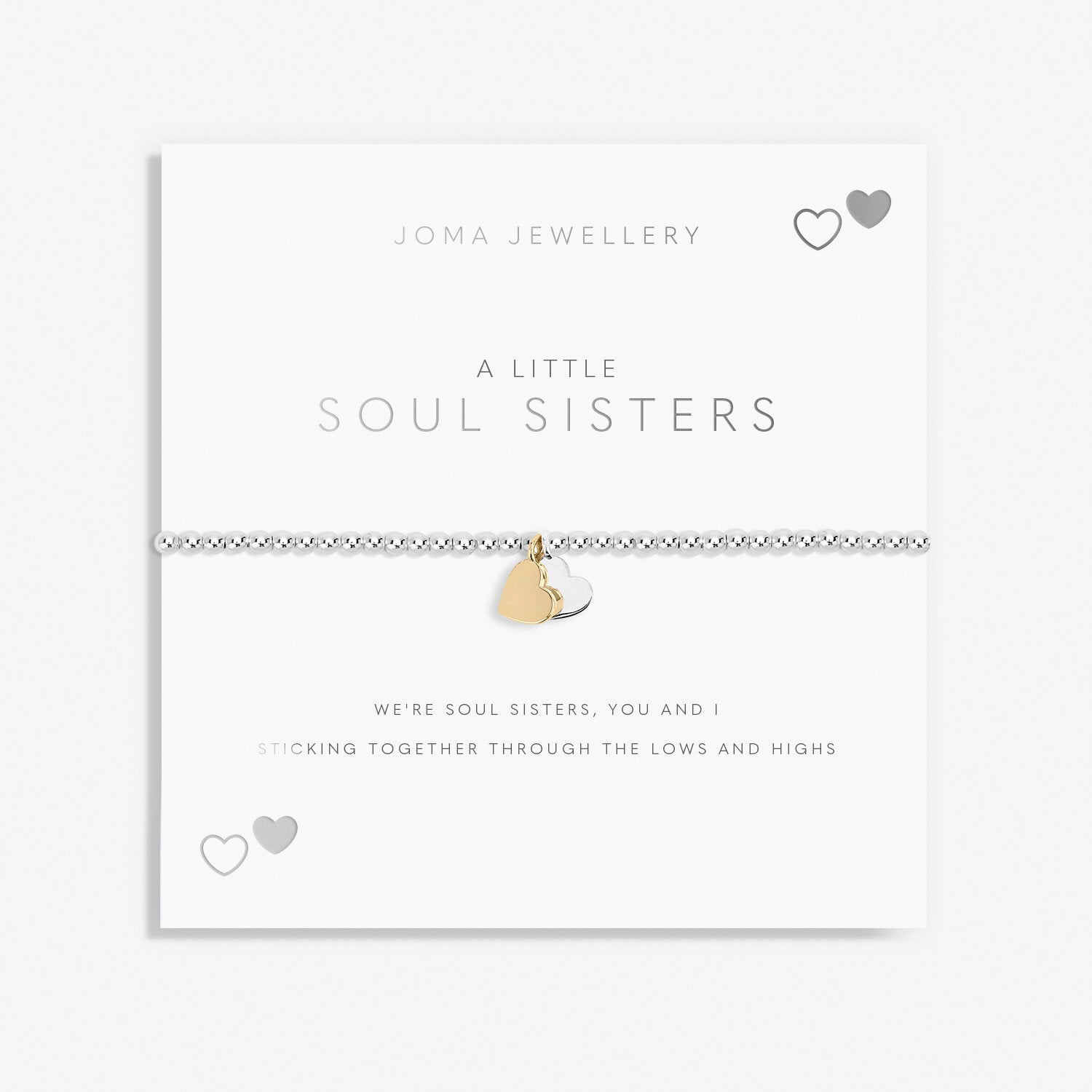 This elegant, sophisticated bracelet is flexible and stretchy with solid gold and silver heart charms and packaged on a sentiment card that reads 'We’re soul sisters you and I sticking together through the lows and highs’' Perfect as an individual piece or can be worn stacked with other Joma Bracelets. Size 17.5cm.