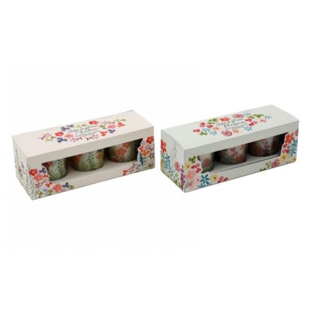 Fill your room with the sweet scents of spring! These little candles come in glass pots with a lovely floral design.