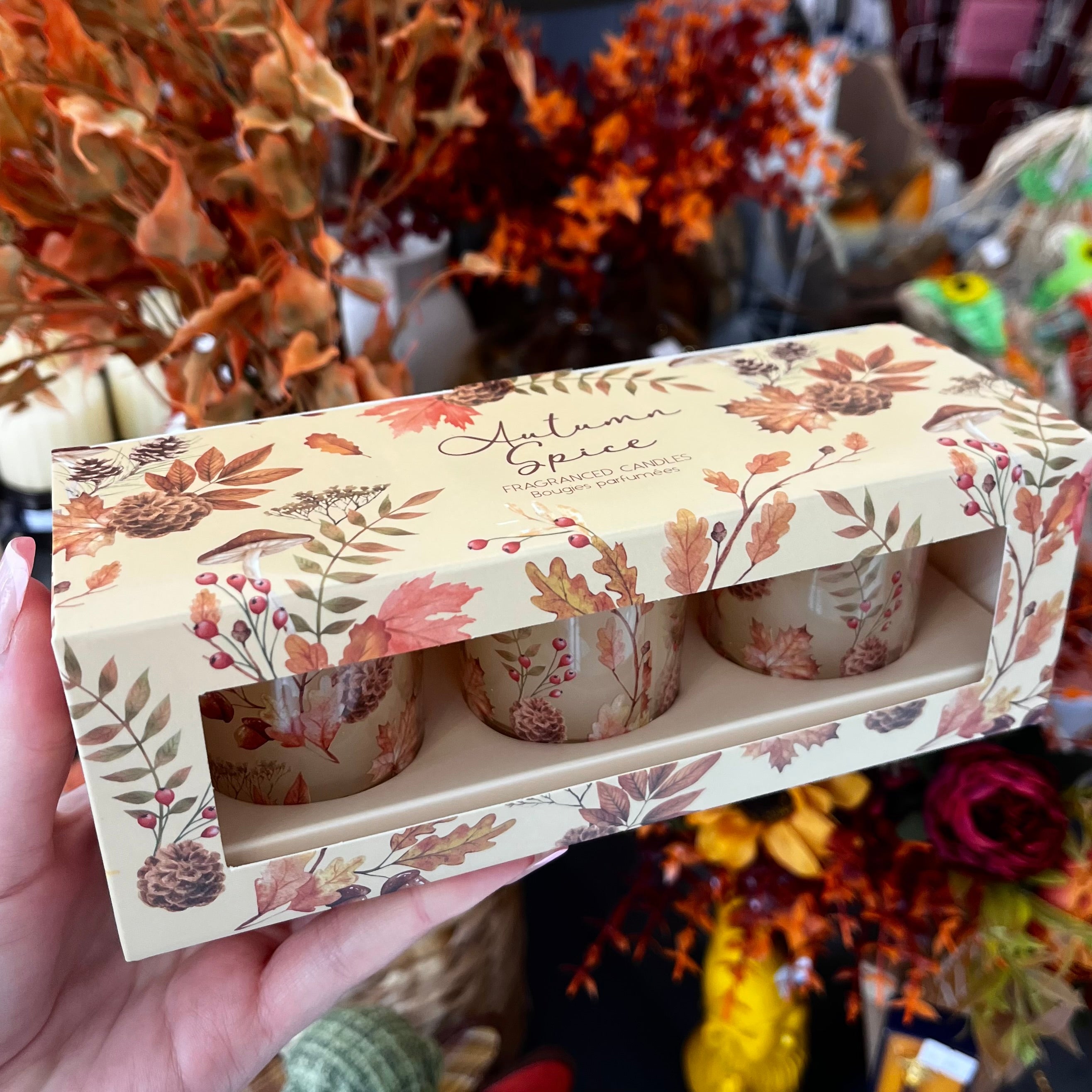 Each set includes three beautifully crafted votive candles in warm autumnal scents, presented in a sleek and elegant box.