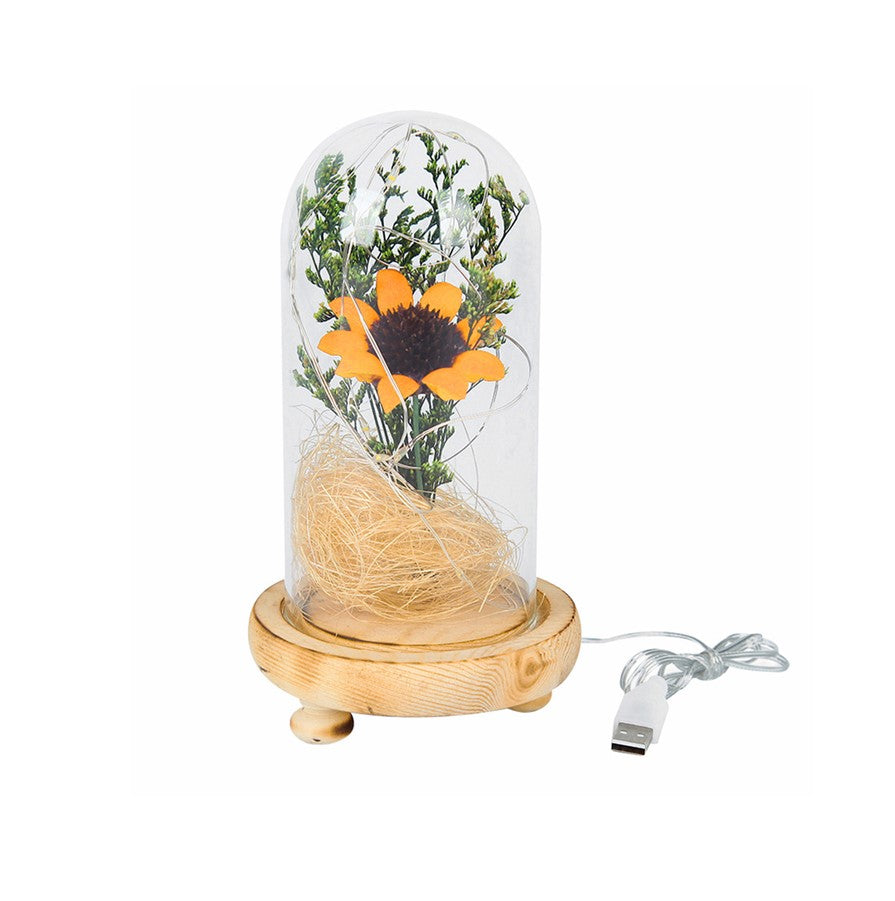 Wooden base with removable glass dome featuring a sunflower and grass arrangement.