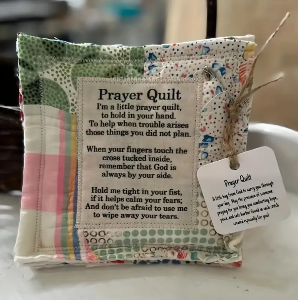 This pocket prayer quilt features an inspirational quote stitched onto the prayer quilt which has a little wooden cross inside.