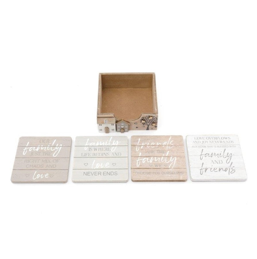 Wooden Set Of 4 Coasters In Assorted Phrase Designs With a Holder With 3D Houses As The Design On. Priced As a Set Of 4 Coasters and a Holder