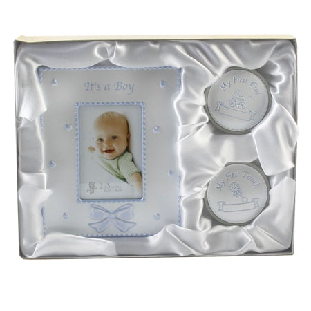 A traditional Baby Boys Gift Set. Comprising of a 2x3 Photo Frame, 1st Tooth Box and 1st Curl Box. Packaged in luxurious box.