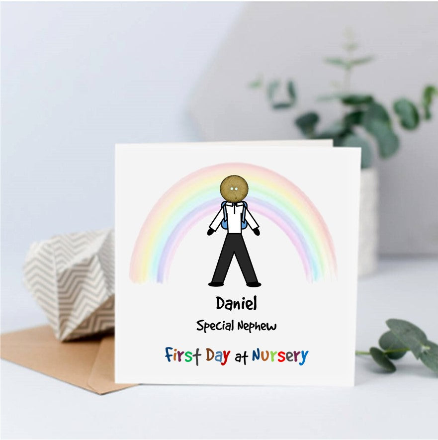 Card Features the child as a male or female button head character with backpack on - ready to start their new adventure. The rainbow represents happiness and possibilities.