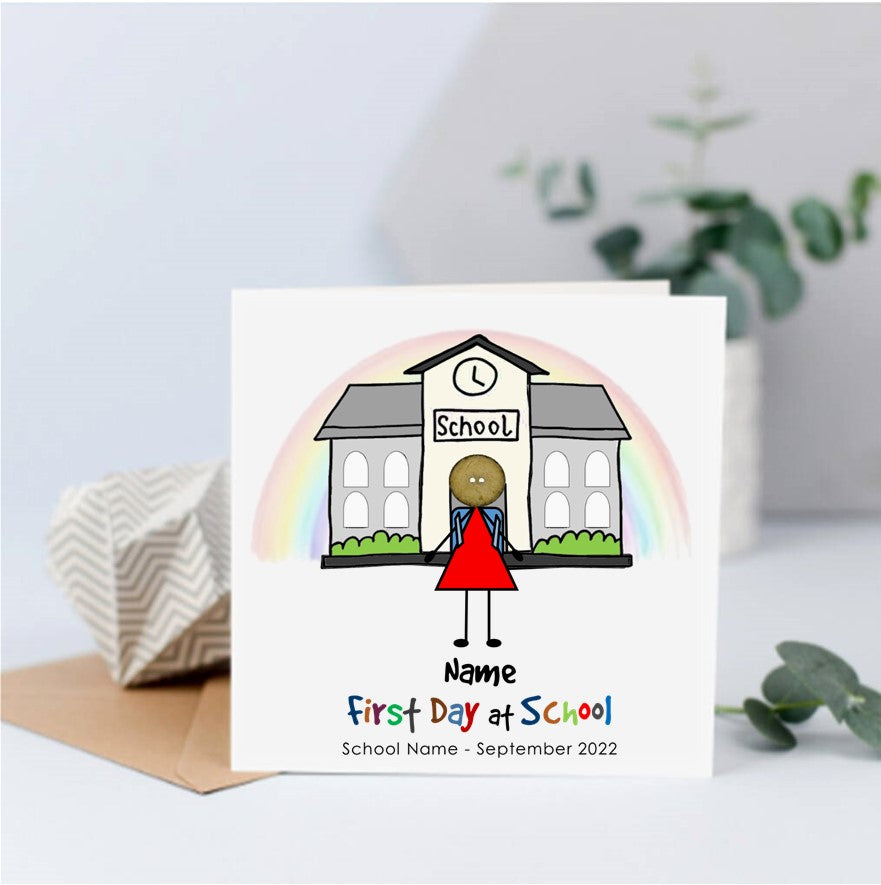 Card Features the child as a male or female button head character with backpack on - ready to start their new adventure. The rainbow represents happiness and possibilities.