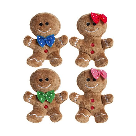 A cute and cuddly assortment of Gingerbread Boy and Girl soft toys, each complete with coloured bows and gumdrop buttons