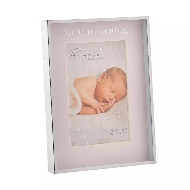 The silver metal frame features a soft pink mount which surrounds the portrait aperture and is completed by its ‘My Christening’ silver decal.