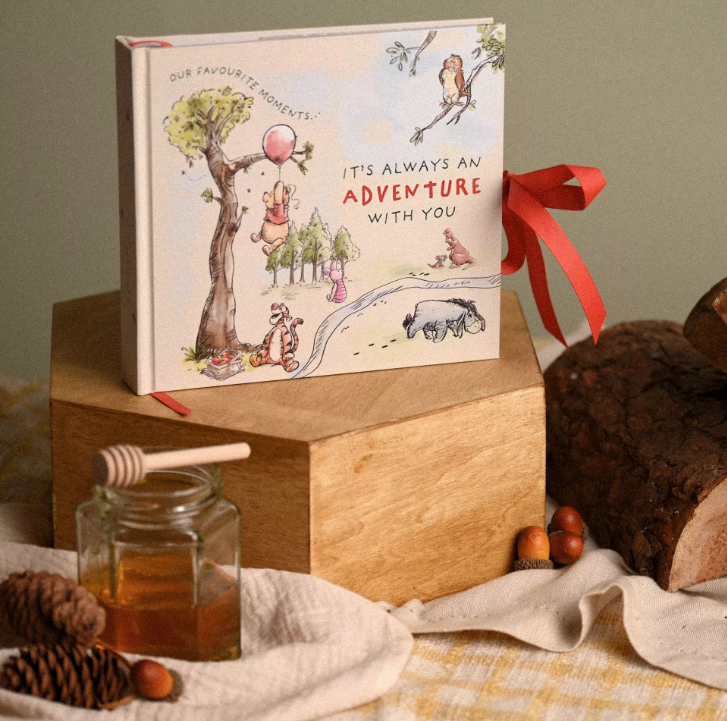 The beige album displays showcases gorgeous colour illustrations of Winnie the Pooh and friends, complete with ‘It’s Always an Adventure with You’ front cover title and ‘My First Photos’ wording on the spine.