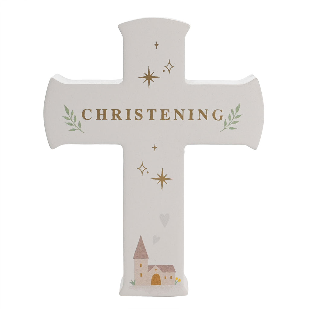 A wooden ‘Christening’ mantel cross plaque by Faith & Hope from CELEBRATIONS®.
