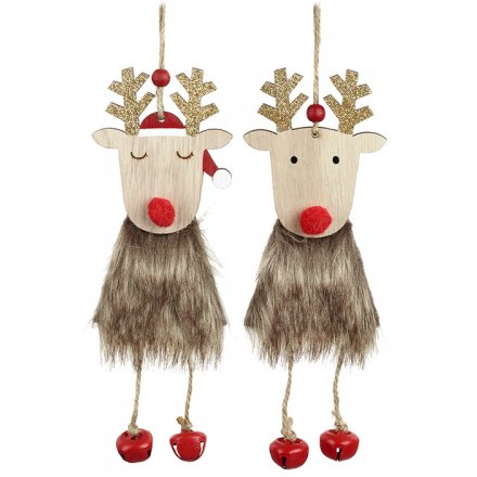 A cute and festive mix of hanging wooden reindeer decorated with faux fur trimmings and red accents