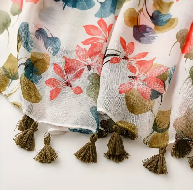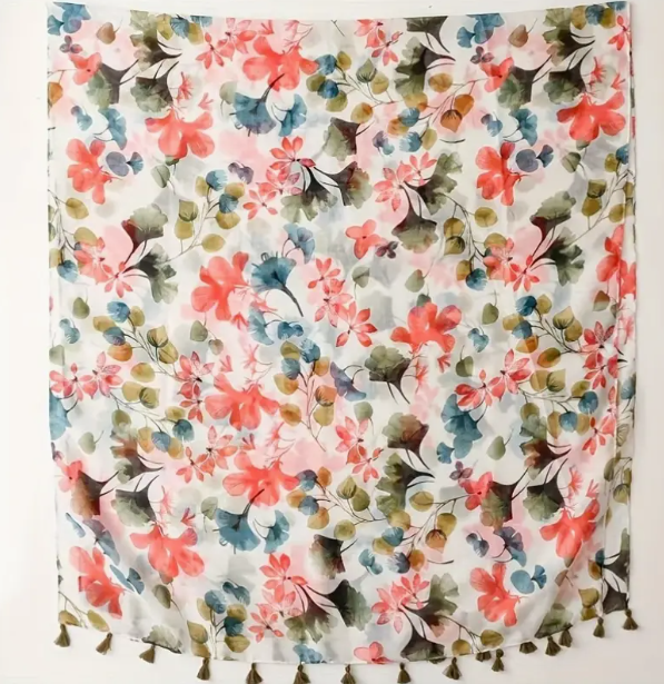 Green and Pink Floral Scarf With Tassels