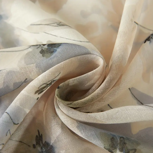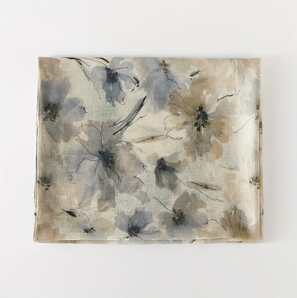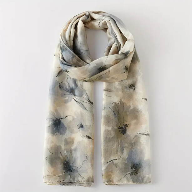 This brown floral scarf with hints of soft blue, is the essence of serenity. This is perfect for spring and summer outfits to bring soft, calming colours to your wardrobe.