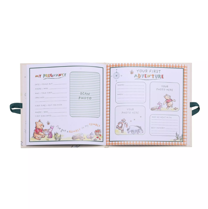 It holds personalised pages for each special moment - with space for photographs - and is finished with green ribbon bow.