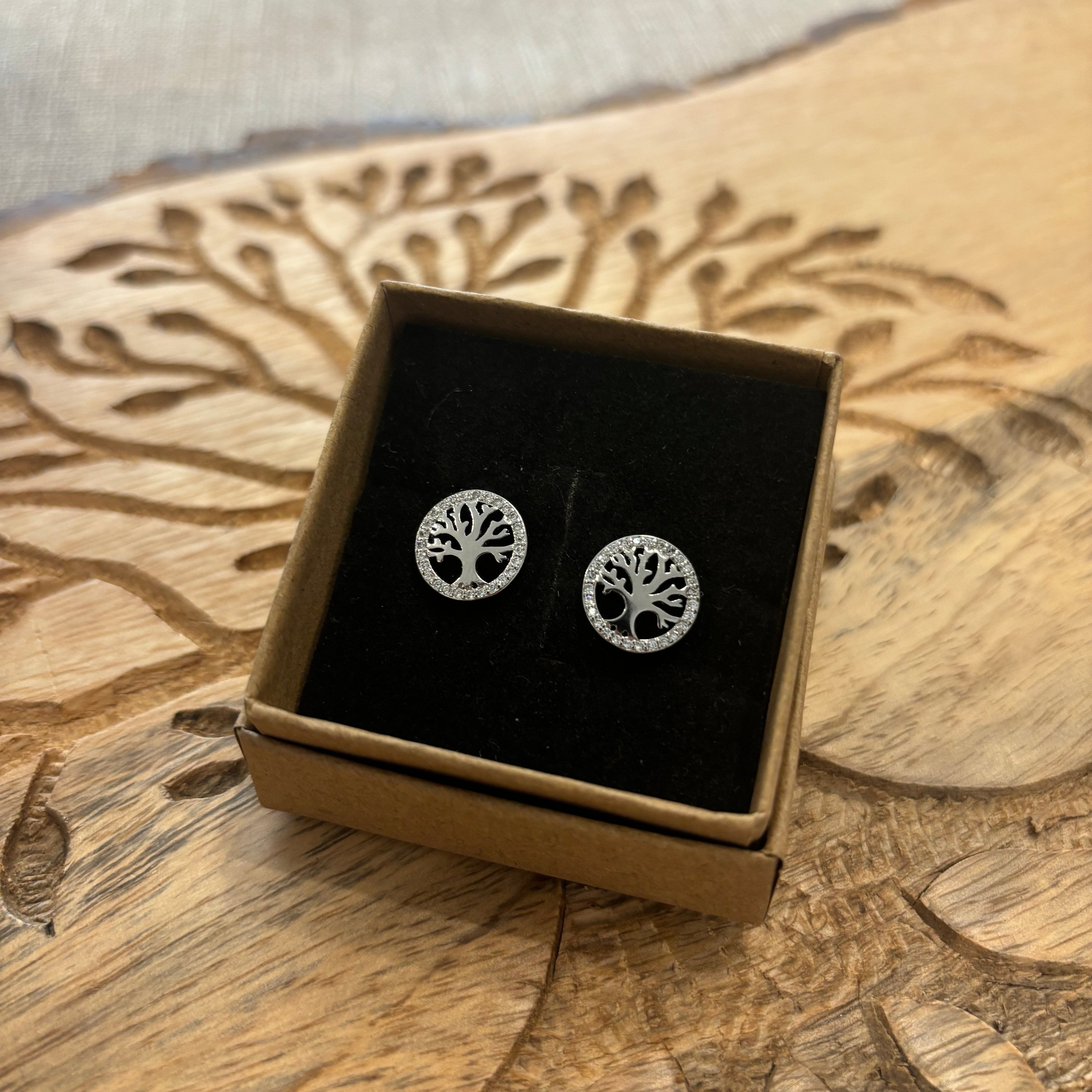 Tree of Life symbolism stud earrings featuring diamante stones circling the inner tree.
