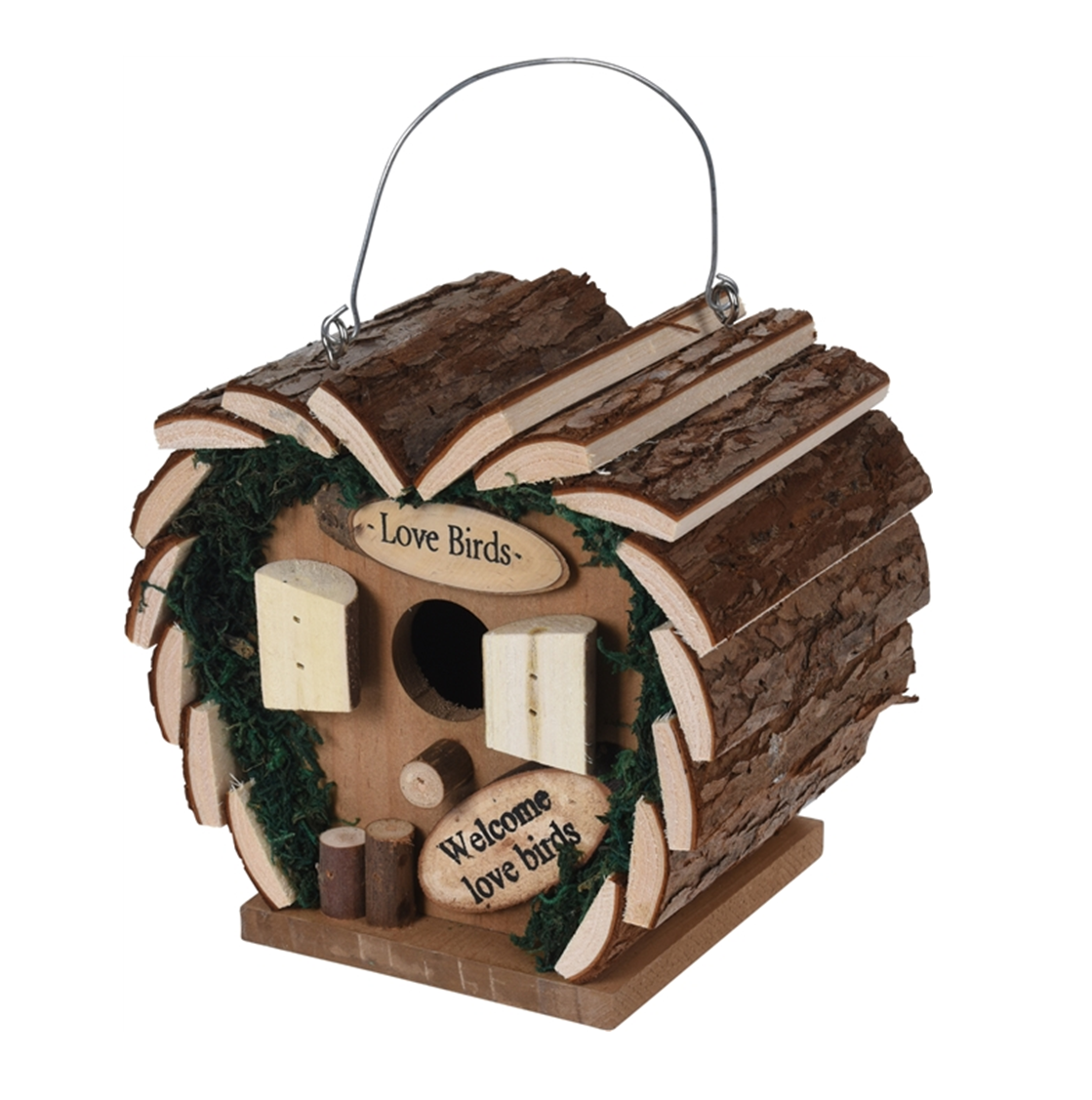 Wooden Bird House With Logs Making Heart Shape And Love Birds Text On Front