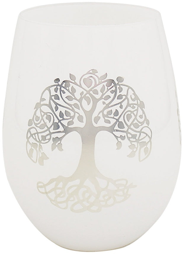 A simply stunning stemless glass in a frosted white colouring featuring the meaningful tree of life symbol in silver. A luxurious and useful product.