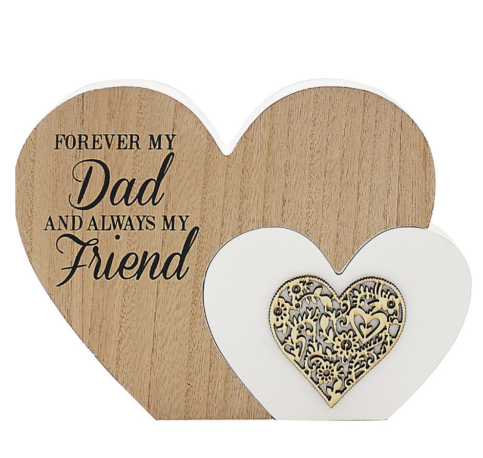 A charming set of two hearts with a smaller white block heart fitting and script 'Forever my Dad and always my Friend' quote