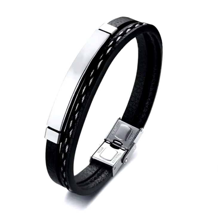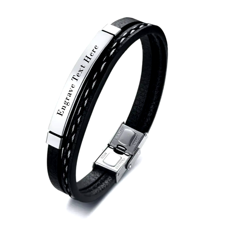Black Leather Bracelet with two bands. One weaved leather and one with metal band that can be engraved (option available)