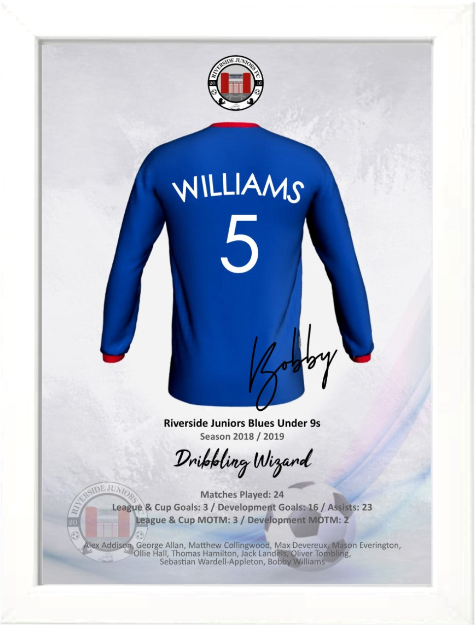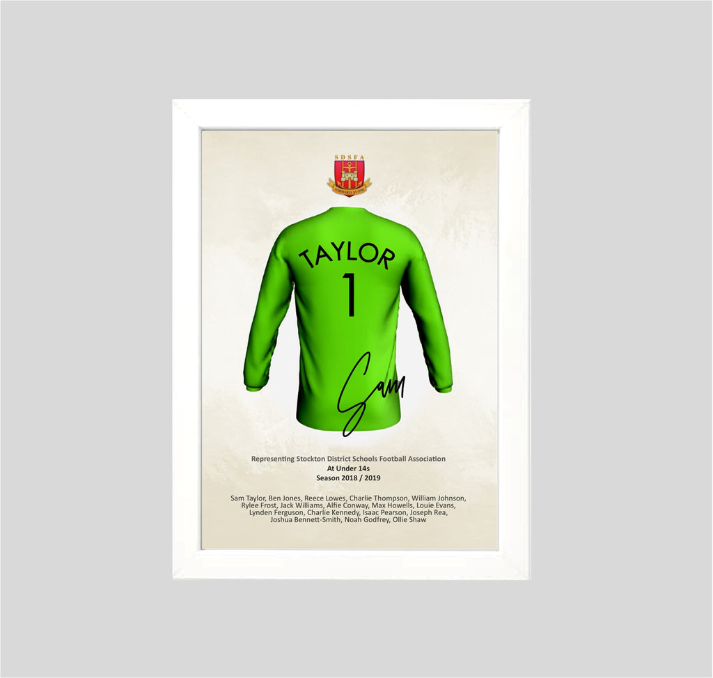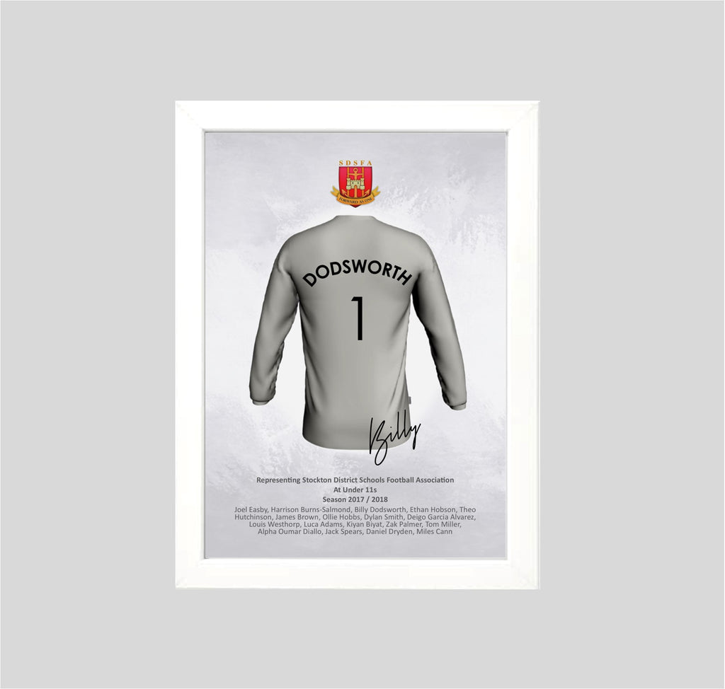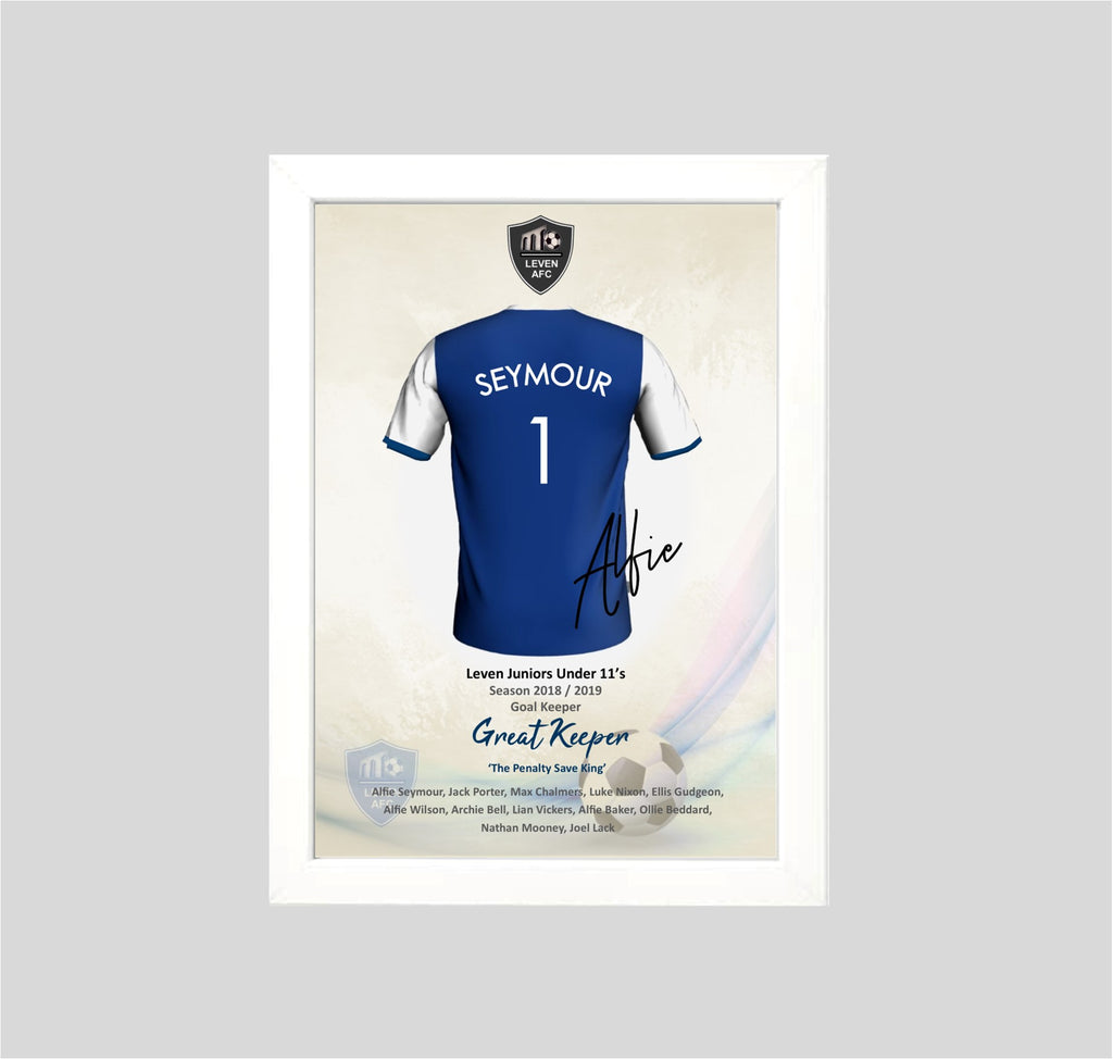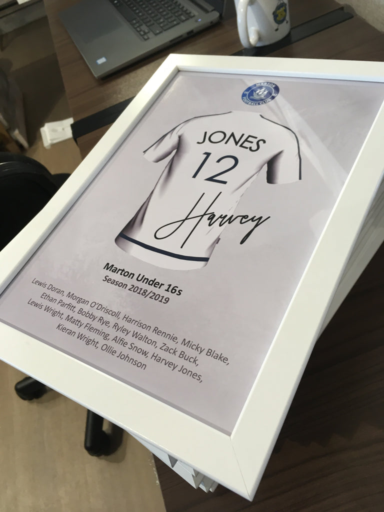 An eye catching design that is created to match a team’s football strip! Finished in high definition capturing the strip perfectly proudly featuring surname and number (if required), signature and team information.