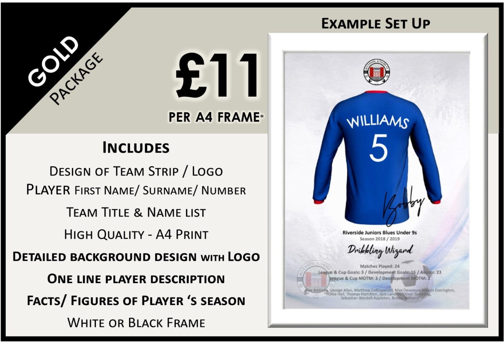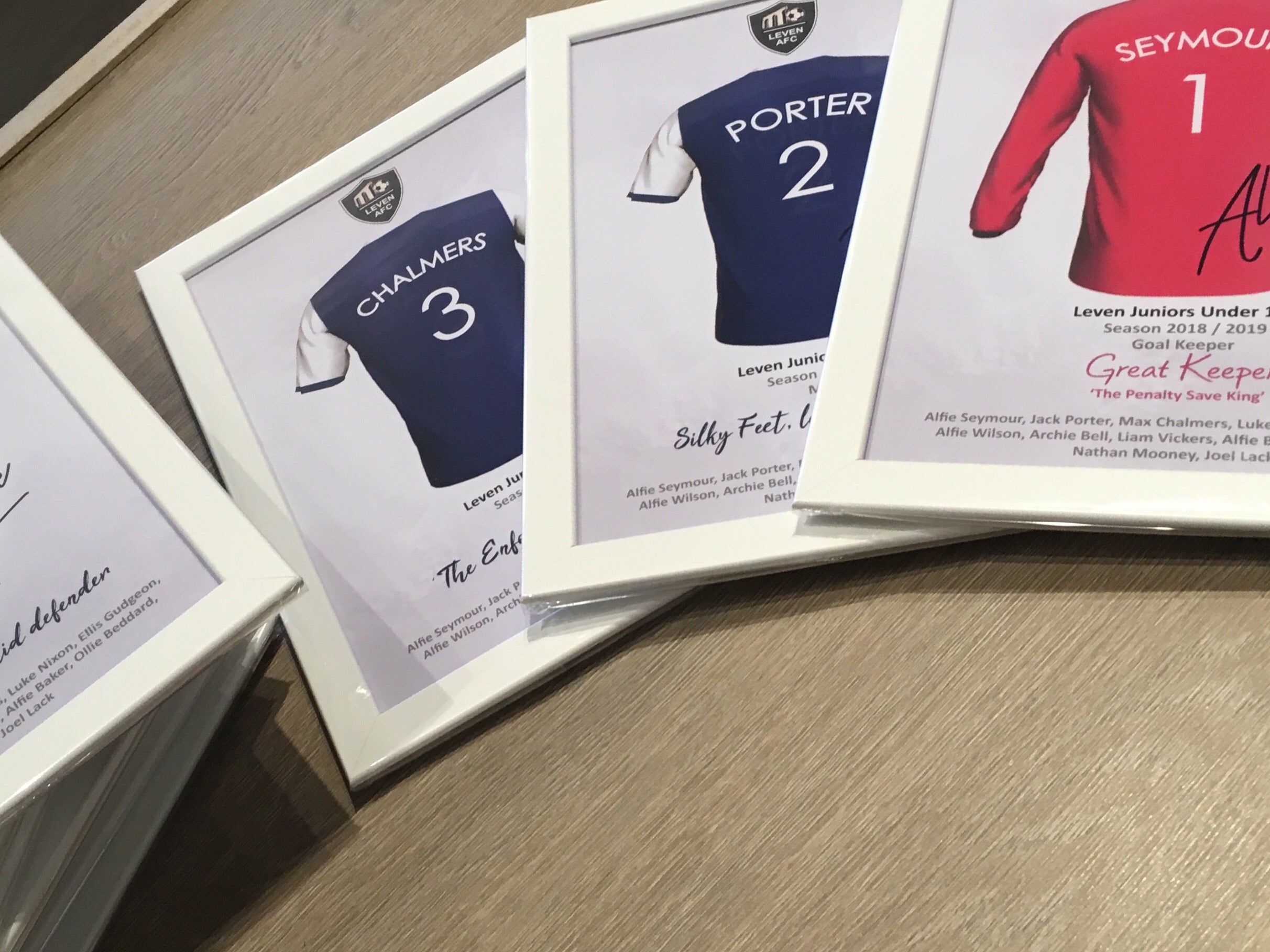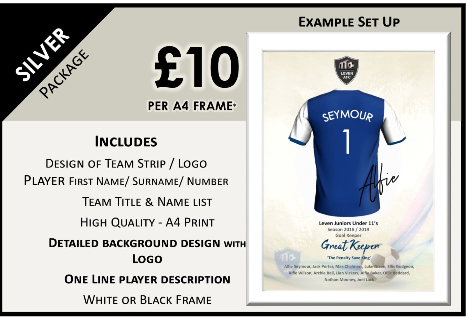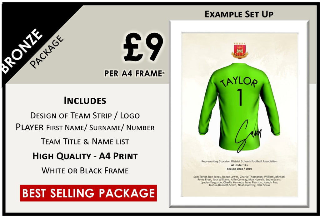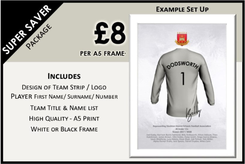 An eye catching design that is created to match a team’s football strip! Finished in high definition capturing the strip perfectly proudly featuring surname and number (if required), signature and team information.