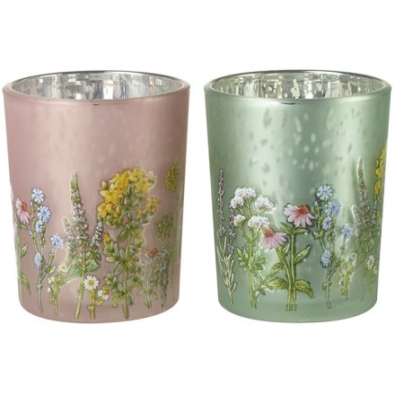 A floral tealight holder in 2 assorted designs. Featuring mini detailed images of flowers decorated around the lower half of the holder.