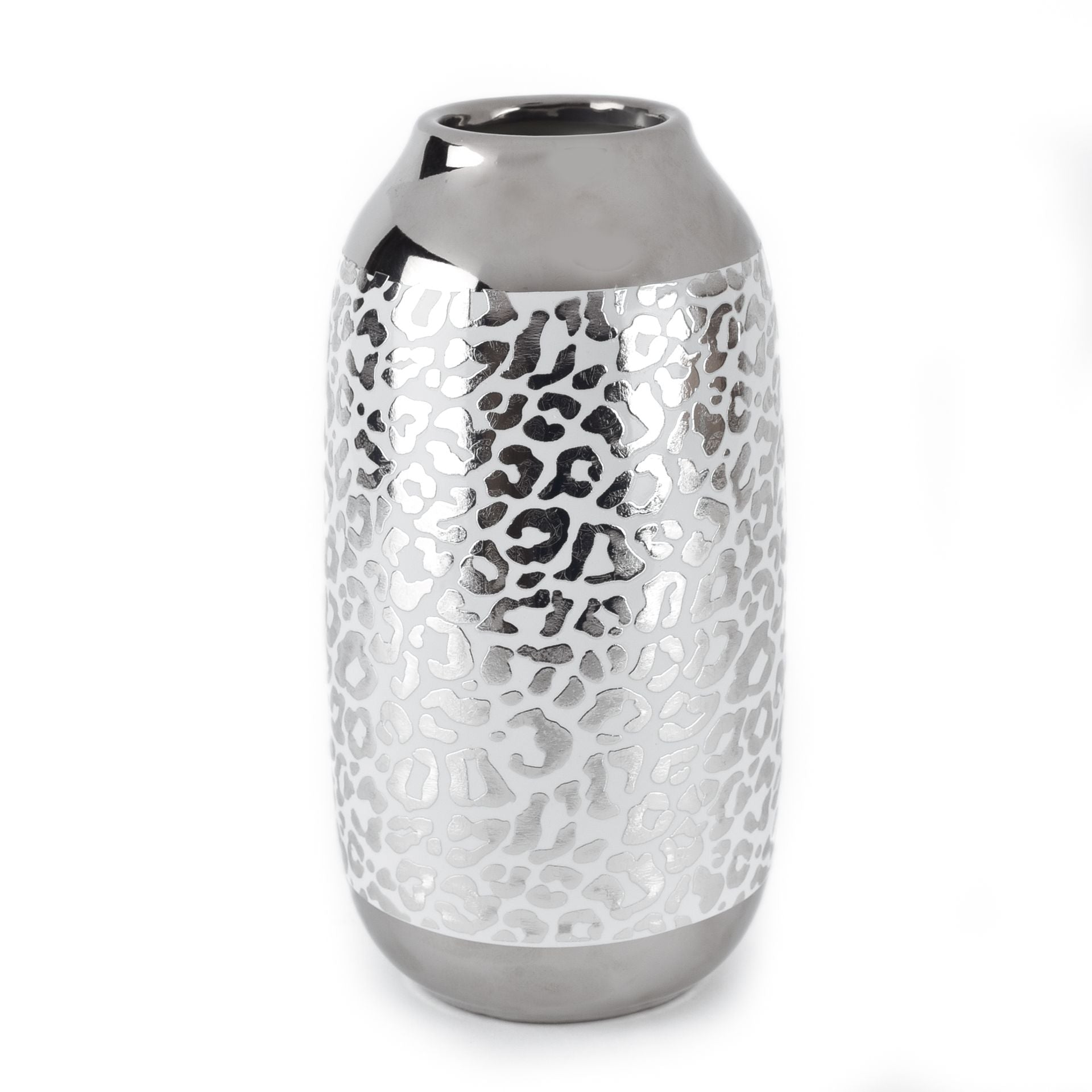 A stylish silver mirror electroplated leopard print pattern ceramic vase. From HESTIA® Luxe Living - contemporary class and style in homeware.
