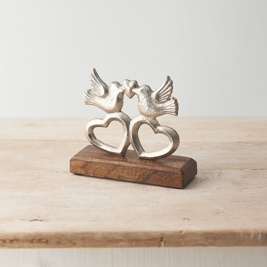 A charming ornament featuring two love birds with hearts set upon a chunky mango wood base.