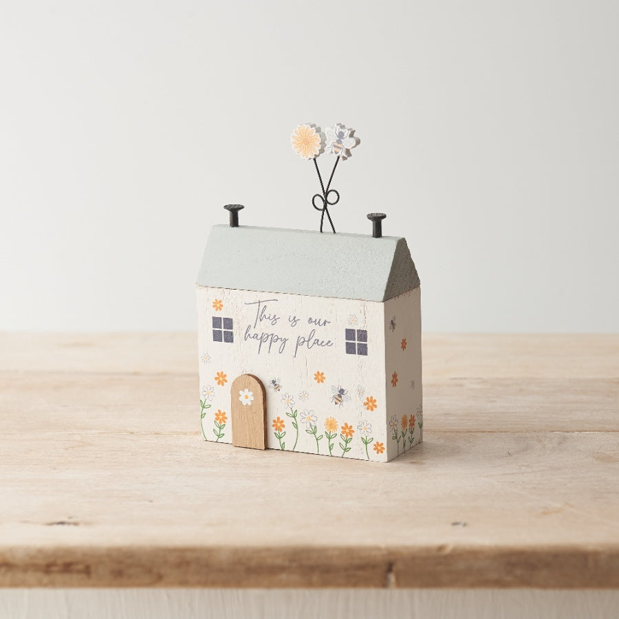 A sweet wooden house decoration with "this is our happy place" text and 3D detailing including flowers and bees.