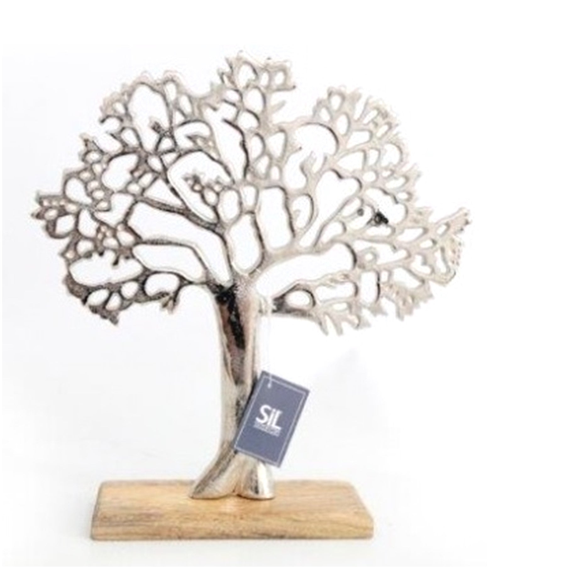 Metal Silver Tree With Lots Of Branching Branches On a Wooden Base