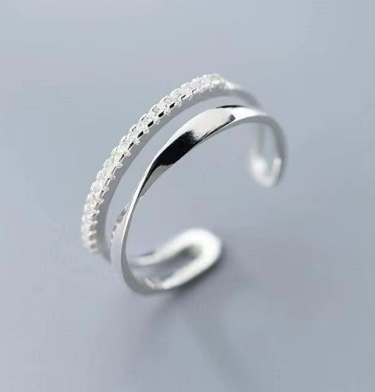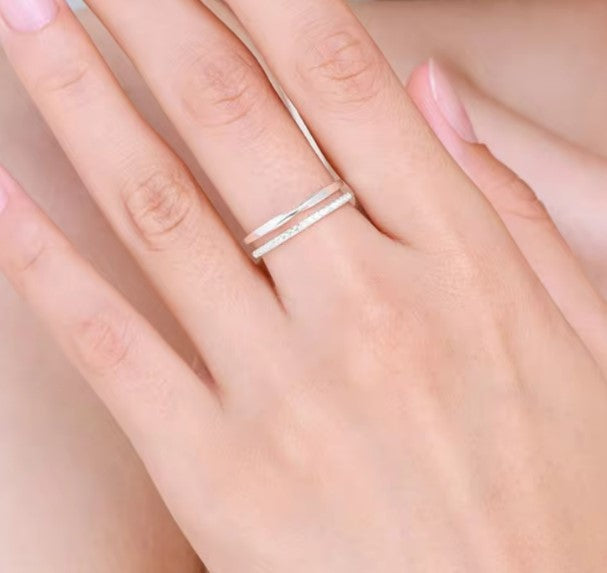 A sterling silver plated double band ring with a stunning diamante band and twisted layer giving the effect of two rings yet connected together.