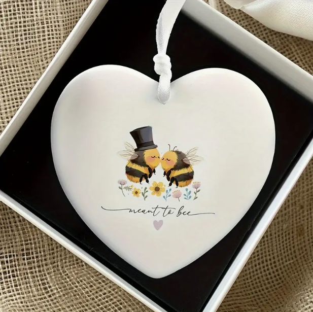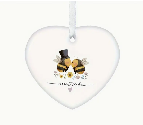 This little hanging heart ornament features the sentiment 'meant to bee' with a bee couple. Its the perfect keepsake for a couple who are engaged and as a wedding gift.
