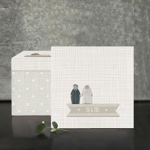 Wooden Keepsake Box designed with a simple and contemporary pattern with a bride and groom embellishment on top of the lid and the words "Mr & Mrs". This box is a lovely way to keep all those special moments of a wedding safe and secure. Perfect as a wedding gift for the happy couple.