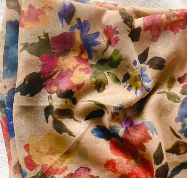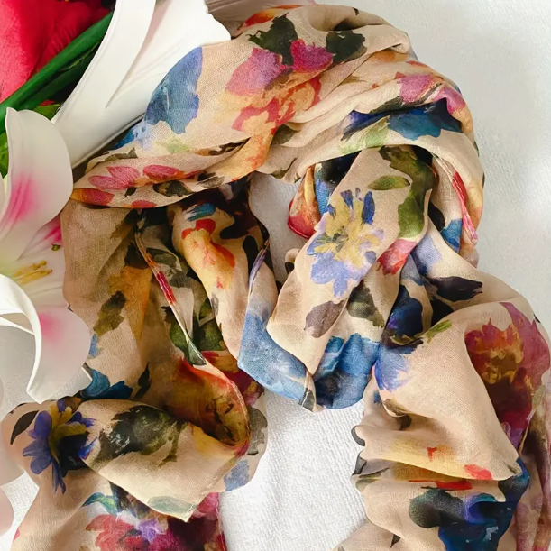 This bright floral scarf will catch the eye of everyone you meet. Its deep and rich colours make it an elegant accessory you need in your wardrobe.