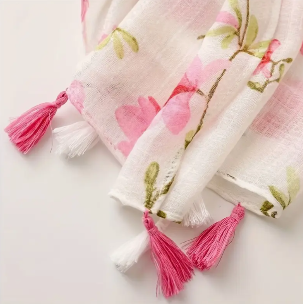 This bright and cheerful scarf is perfect for adding some life into your outfits. With its beautiful pink floral design it is the perfect accessory for springtime.