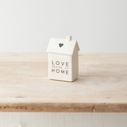 A charming porcelain house decoration with a monochrome colour scheme, "love begins at home" text and cute heart detail.
