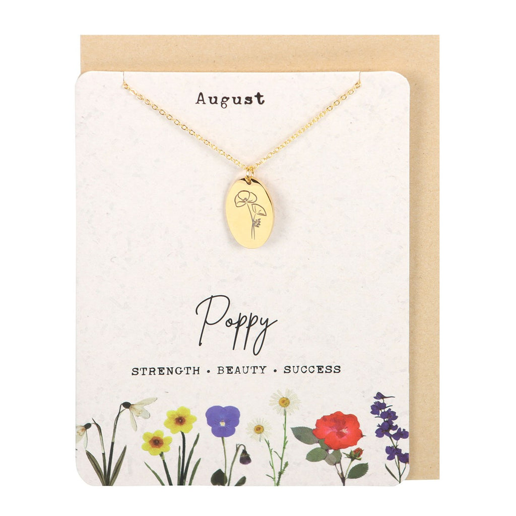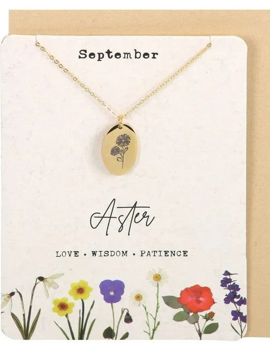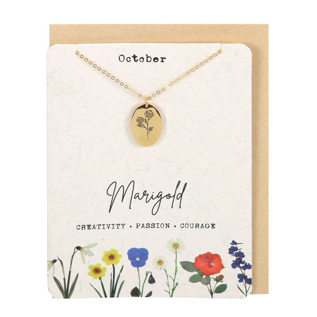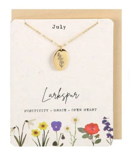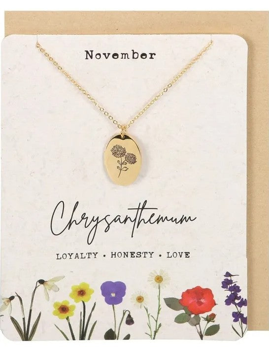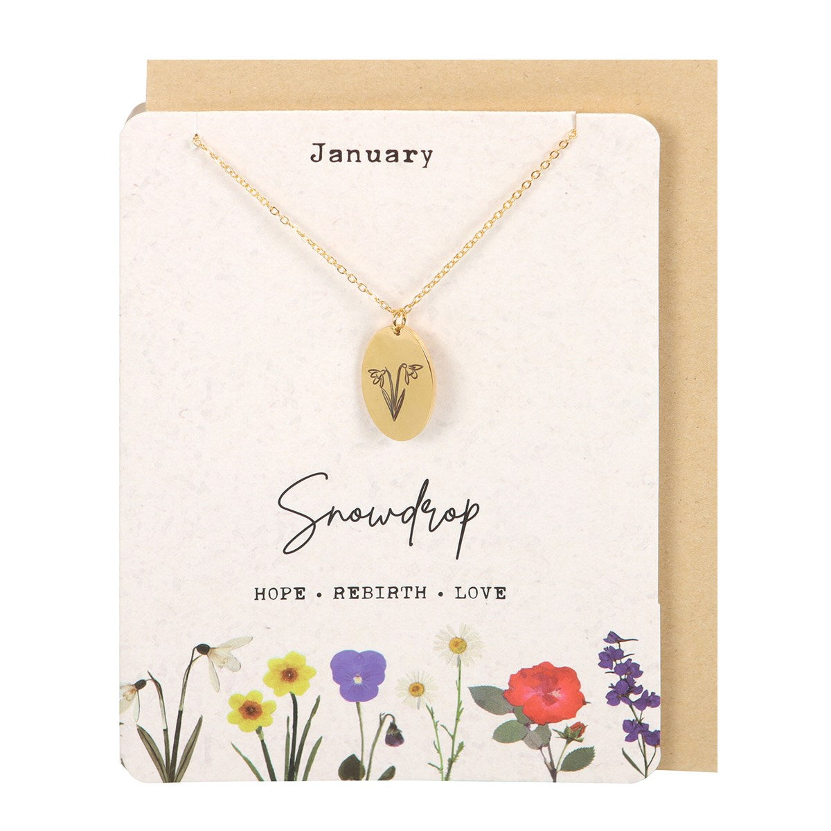 Stunning gold necklaces with engraved birth flower on the necklace charm.