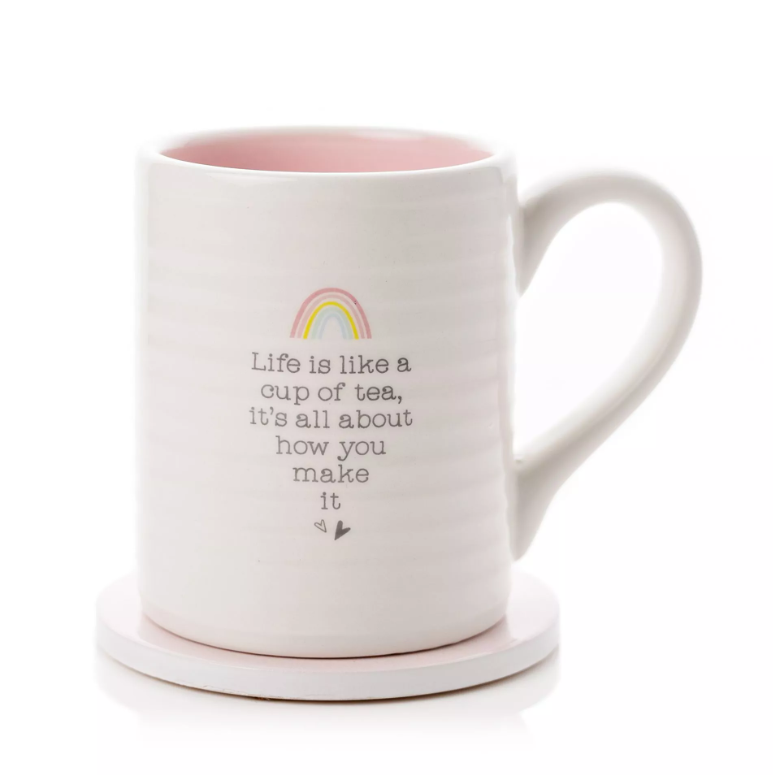 Start your day off right with this cheerful and uplifting Mug & Coaster set.