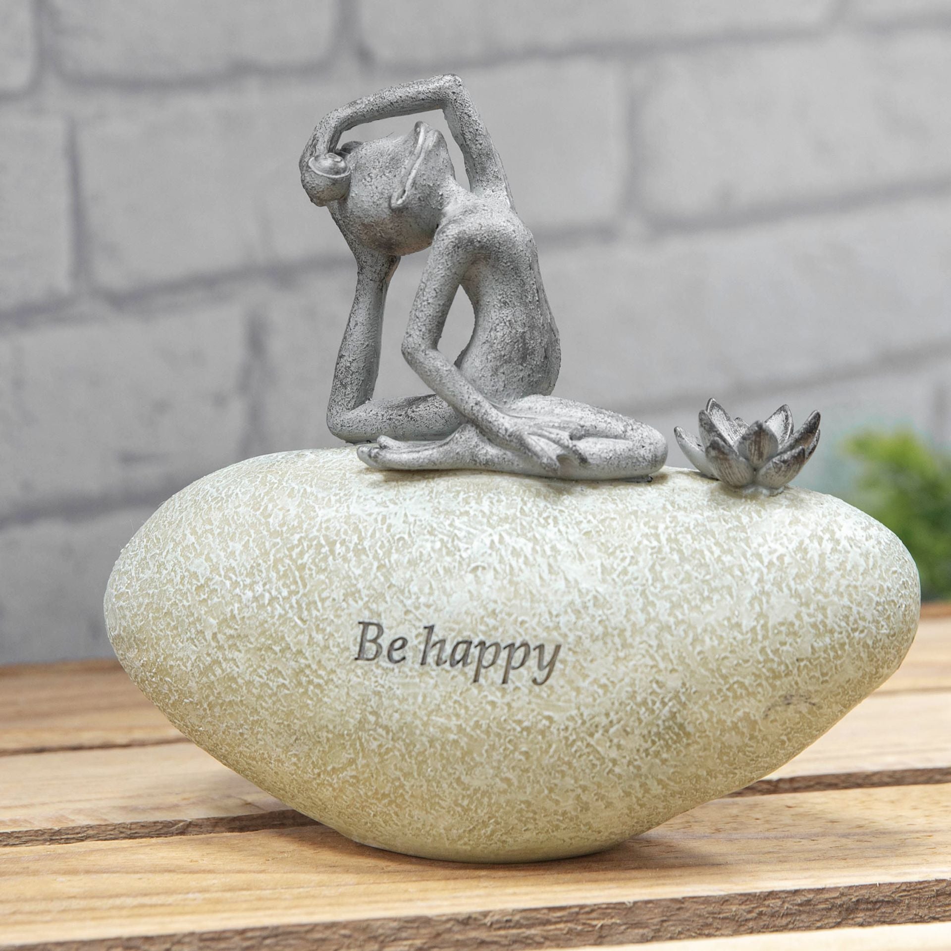 Bring some quirky Zen calm to an outdoor or indoor space with this "Be Happy" yoga frog stone ornament.