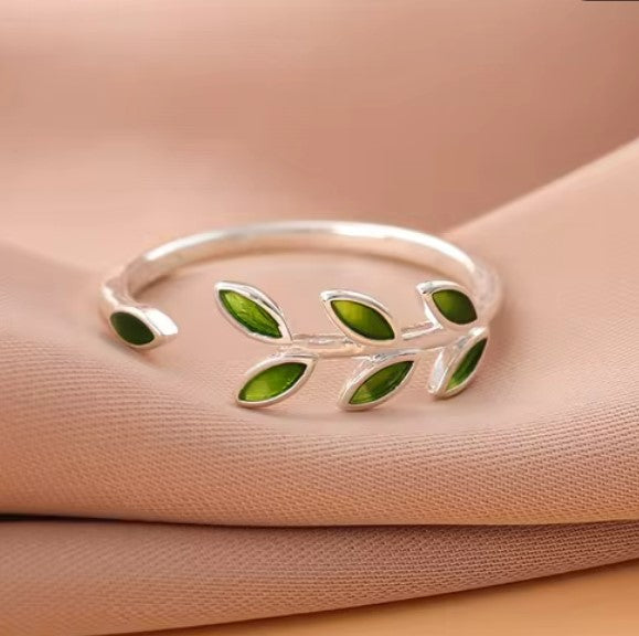 A 925 sterling silver plated ring replicating a branch design with stunning leaves in a green/yellow design.