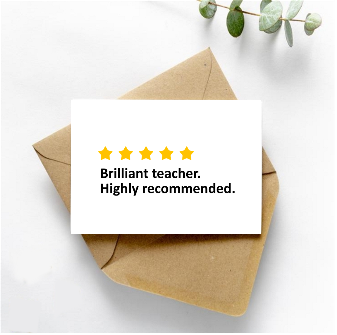 A humorous thank you card for a teacher. A novelty take on a trip advisor review.