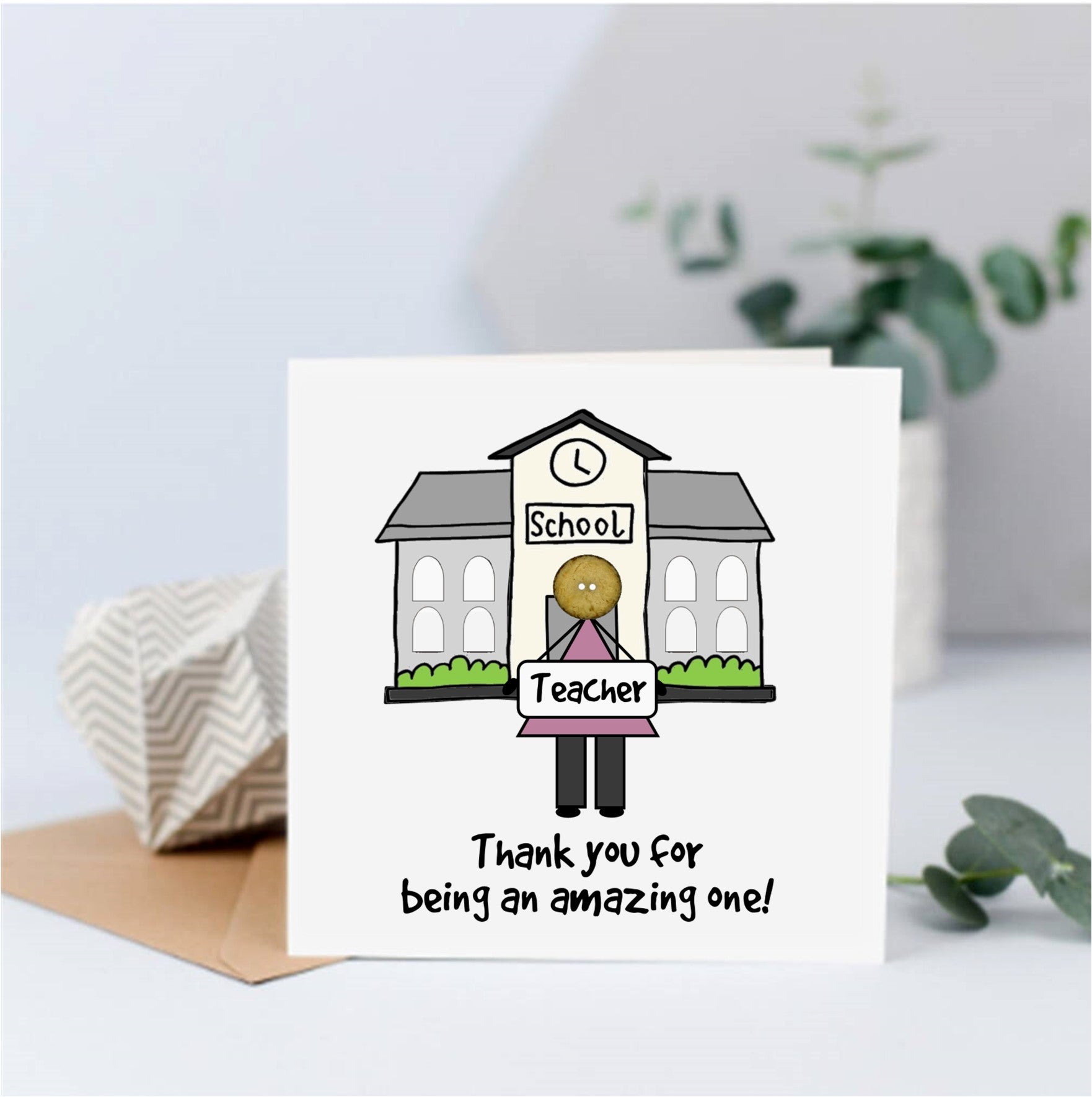 A Teacher appreciation greeting card featuring a male or female teacher to the forefront with a quirky school building in the background. A fun representation of your teacher followed by text that reads 'Thank you for being an amazing one'