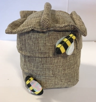 Plush Door Stop In a Box Beehive Design With Bees On The Outside.