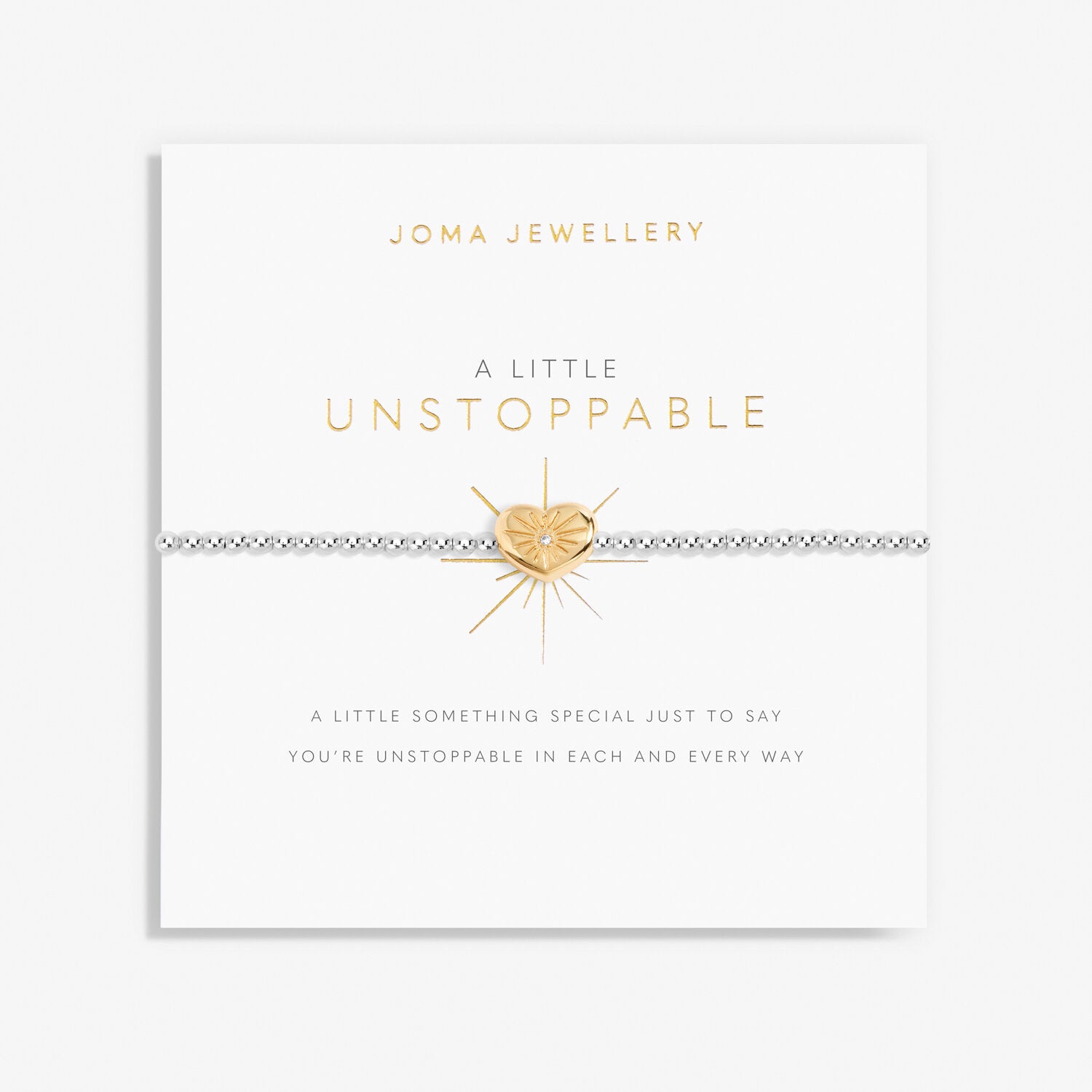 This elegant, sophisticated bracelet is flexible and stretchy, adorned with a Gold-Plated charm and packaged on a sentiment card that reads 'A little something special just to say you're unstoppable in each and every way'. Perfect as an individual piece or can be worn stacked with other Joma Bracelets. Size 17.5cm.