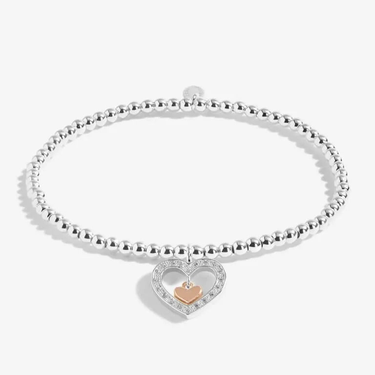 This elegant, sophisticated bracelet is flexible and stretchy with an open silver and rose gold heart and packaged on a sentiment card that reads 'This sparkling bracelet is just to say I love you. Happy Valentines Day' Perfect as an individual piece or can be worn stacked with other Joma Bracelets. Size 17.5cm.