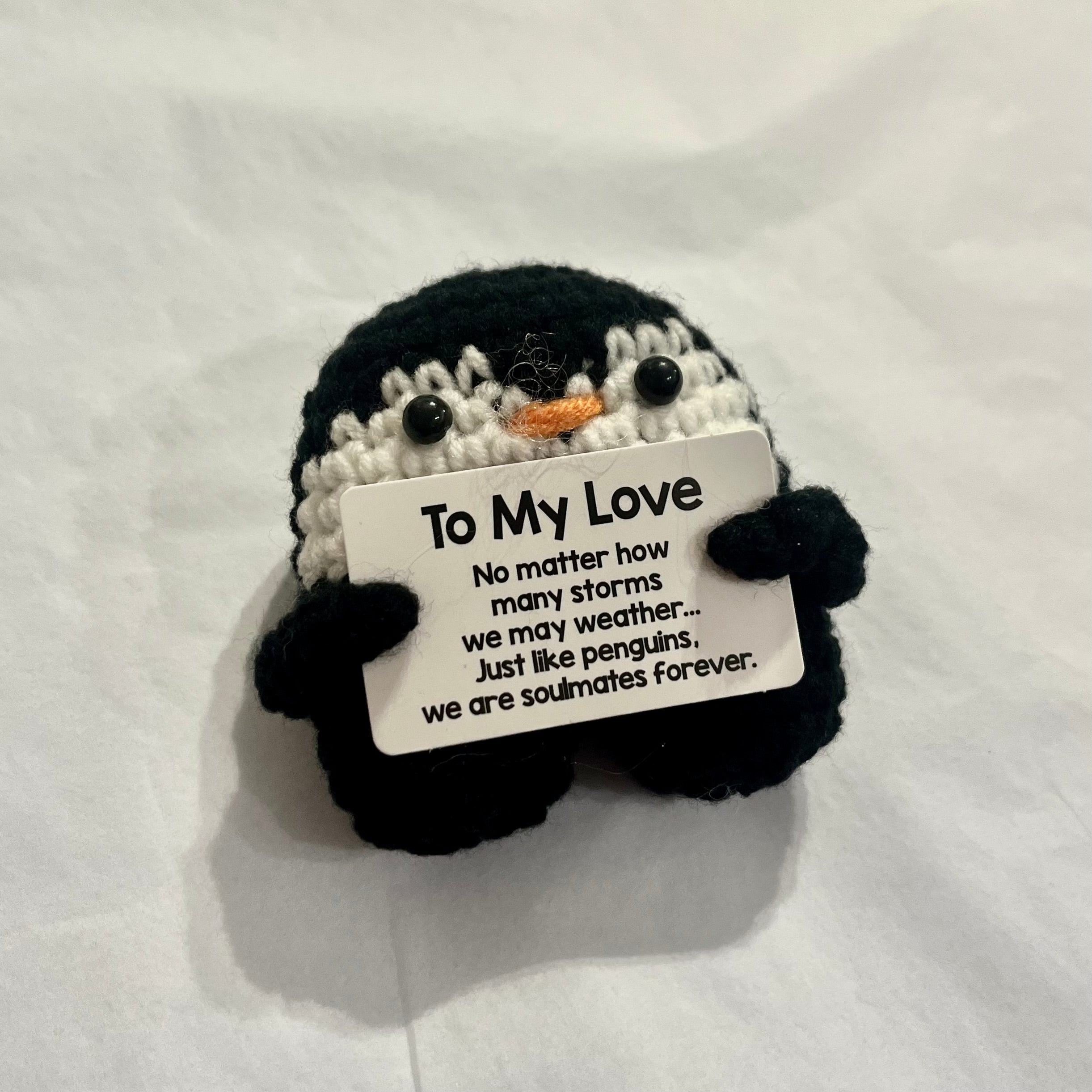 Features a little sign that says 'To My Love, NO matter how many storms we may weather... Just like penguins, we are soulmates forever.'