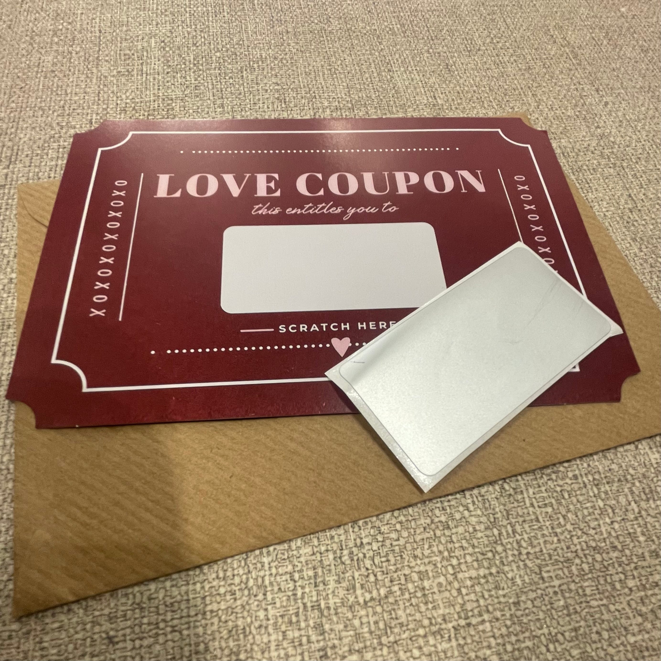 A personal scratch card coupon is the perfect gift for the one you love. Whether its gifting a homemade meal, a massage or experience. You can write on the coupon whatever you want to gift in the white box. Then simply add the scratch panel sticker over the top of the box ready for your love to scratch off the surprise!