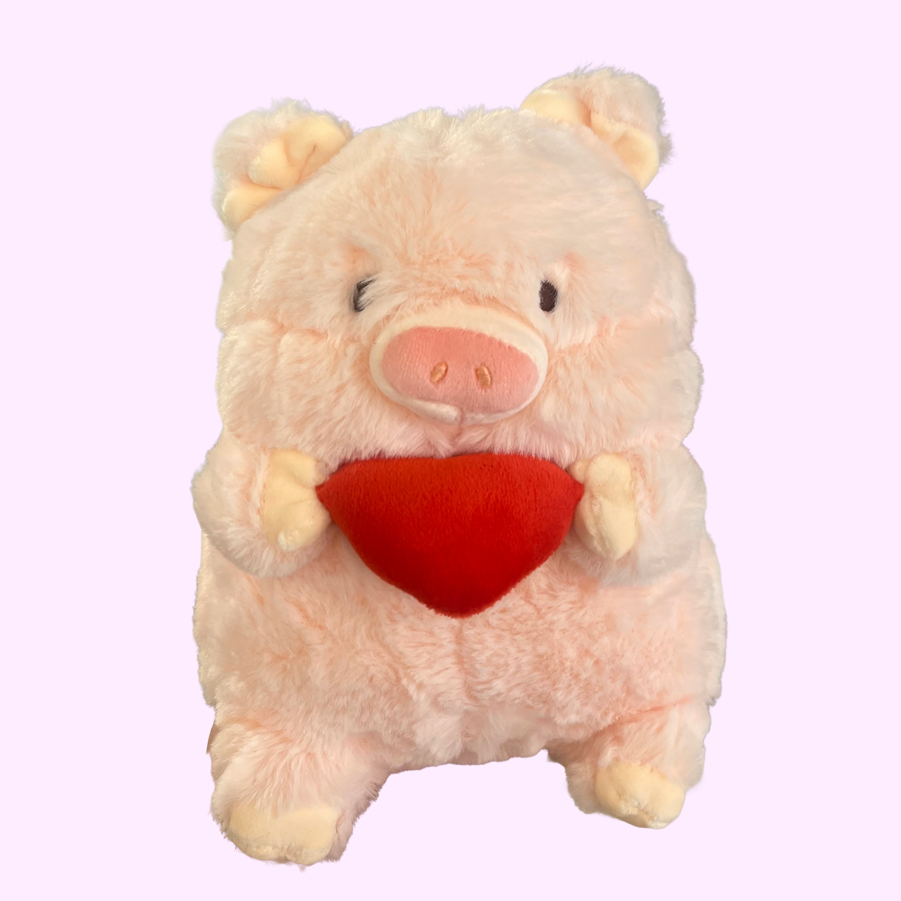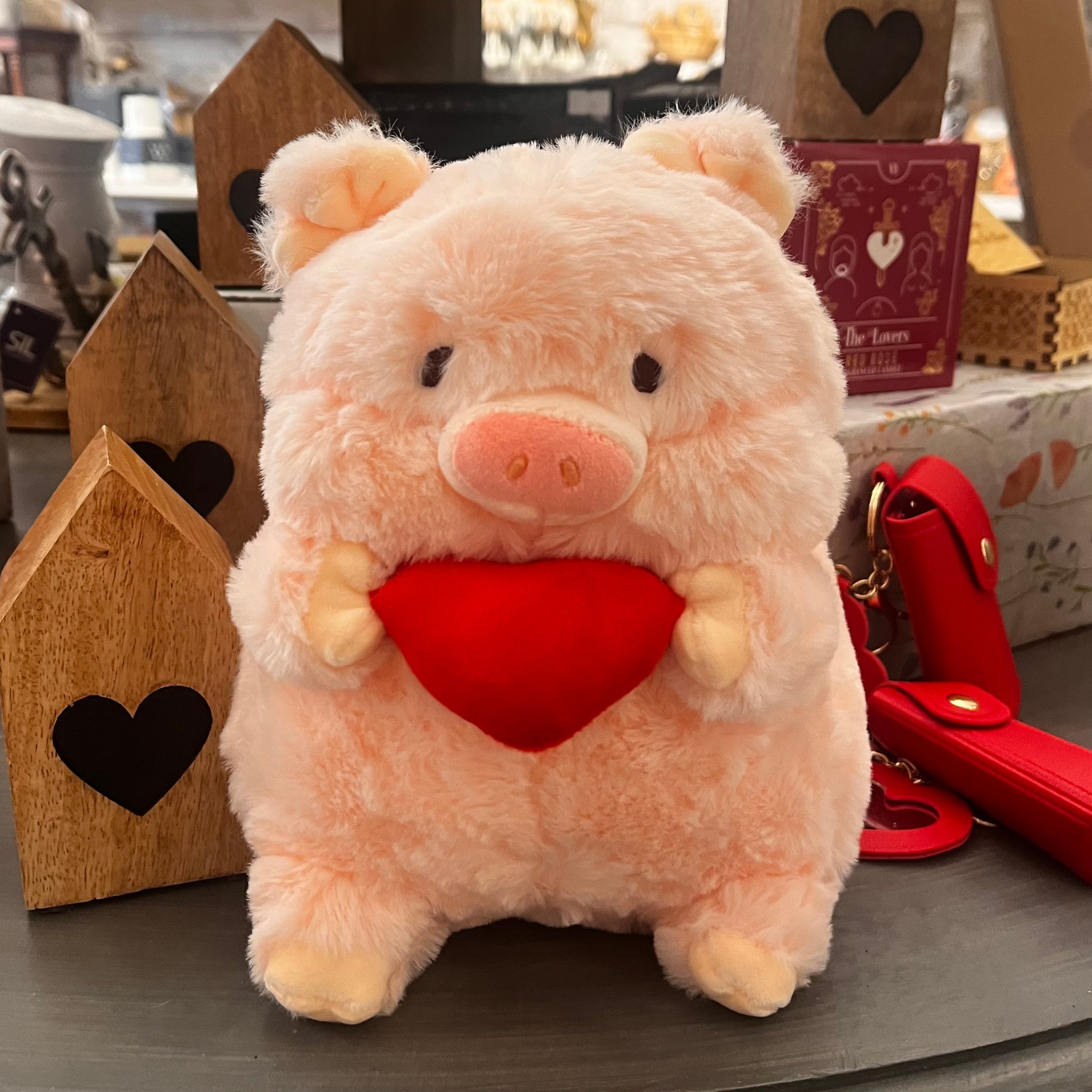 This adorable plush pig holding a heart is a perfect gift for someone you love.