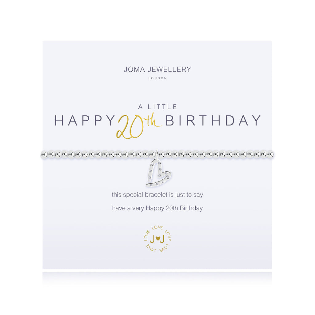 This elegant, sophisticated bracelet is flexible and stretchy with a sparkly open heart charm and packaged on a sentiment card that reads 'This special bracelet is just to say have a very happy 20th Birthday'Perfect as an individual piece or stacked with other Joma Bracelets. Size 17.5cm.
